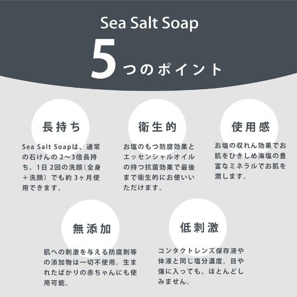 Sea Salt Soapに使用しているのは、瀬戸内海の海水から作られた天然海塩。塩を高配合することで塩そのものの防腐効果が働き、防腐剤などの添加物を一切使用せずに仕上げています。肌にやさしいだけでなく、環境にも配慮した完全無添加処方です。