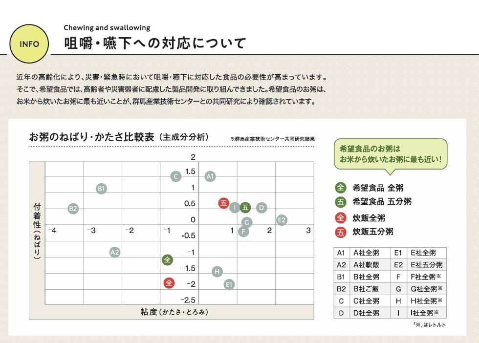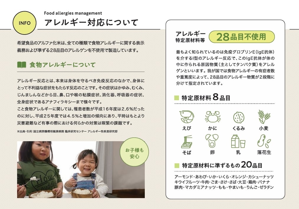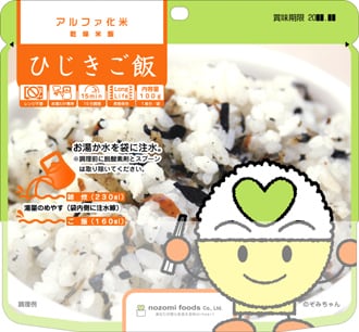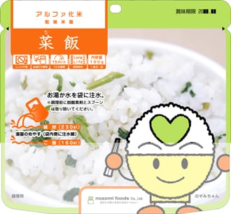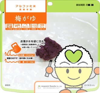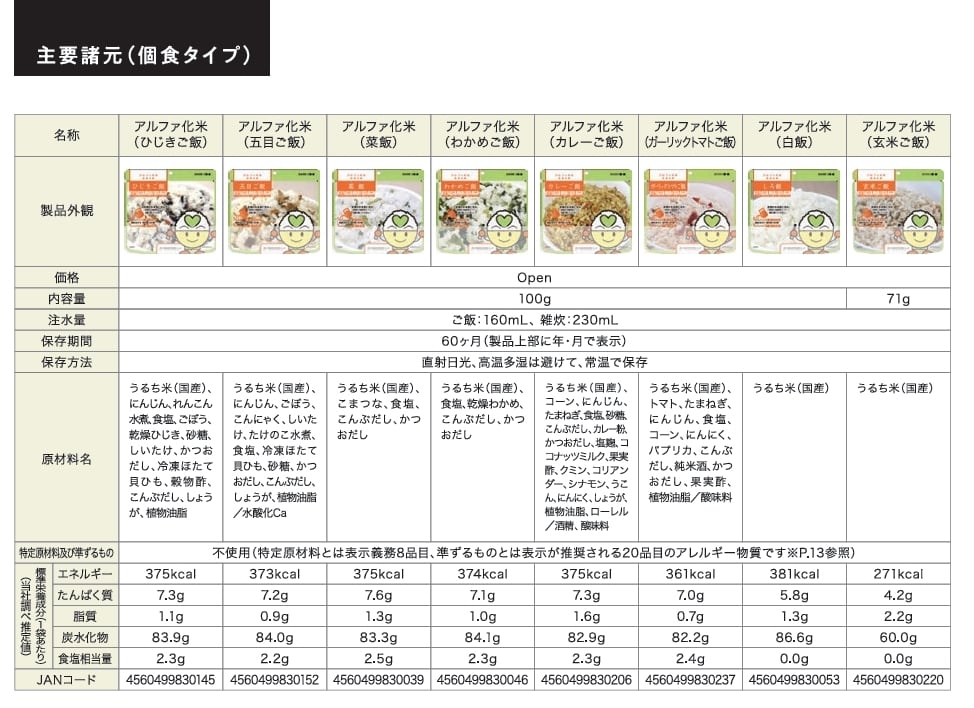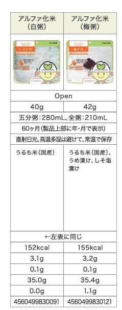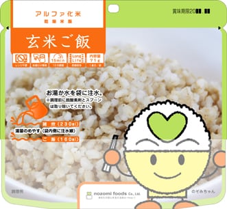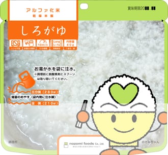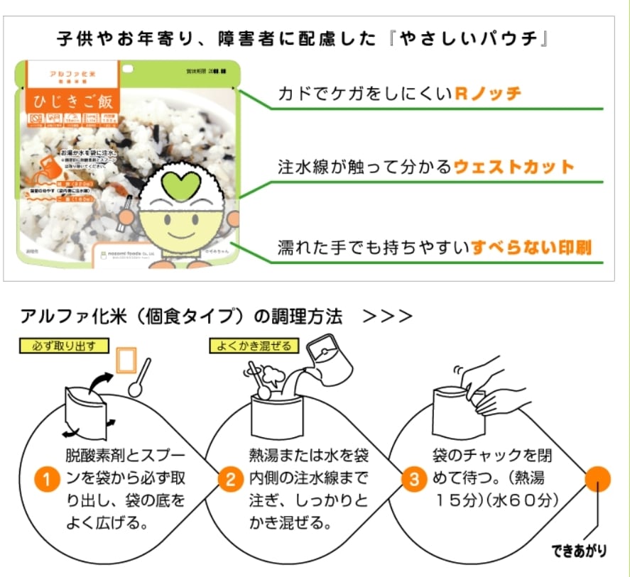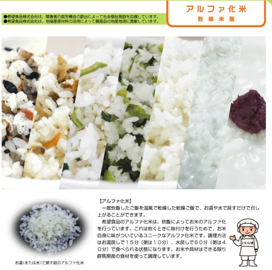 希望食品のアルファ化米は、炊飯によってお米のアルファ化 を行っています。これは炊くときに味付けを行うためで、お米 自身に味がついているユニークなアルファ化米です。調理方法 はお湯戻しで15分(粥は10分)、水戻しで60分(粥は4 0分)で食べられる状態になります。お米や具材はできる限り 群馬県産の食材を使って調理しています。